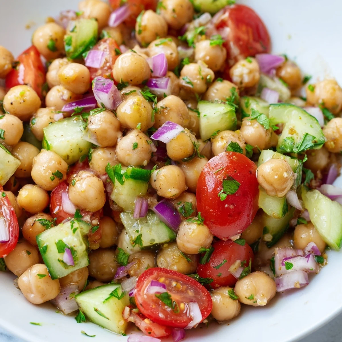 This vibrant Mediterranean salad brings together protein-rich chickpeas with refreshingly crisp cucumber, juicy cherry tomatoes, and aromatic red onion. The bright lemon-herb dressing ties everything together with olive oil, fresh garlic, and fragrant parsley. Ready in just 15 minutes with no cooking required, it's an ideal choice for quick lunches, potluck gatherings, or as a versatile side dish that complements grilled meats and fish beautifully.