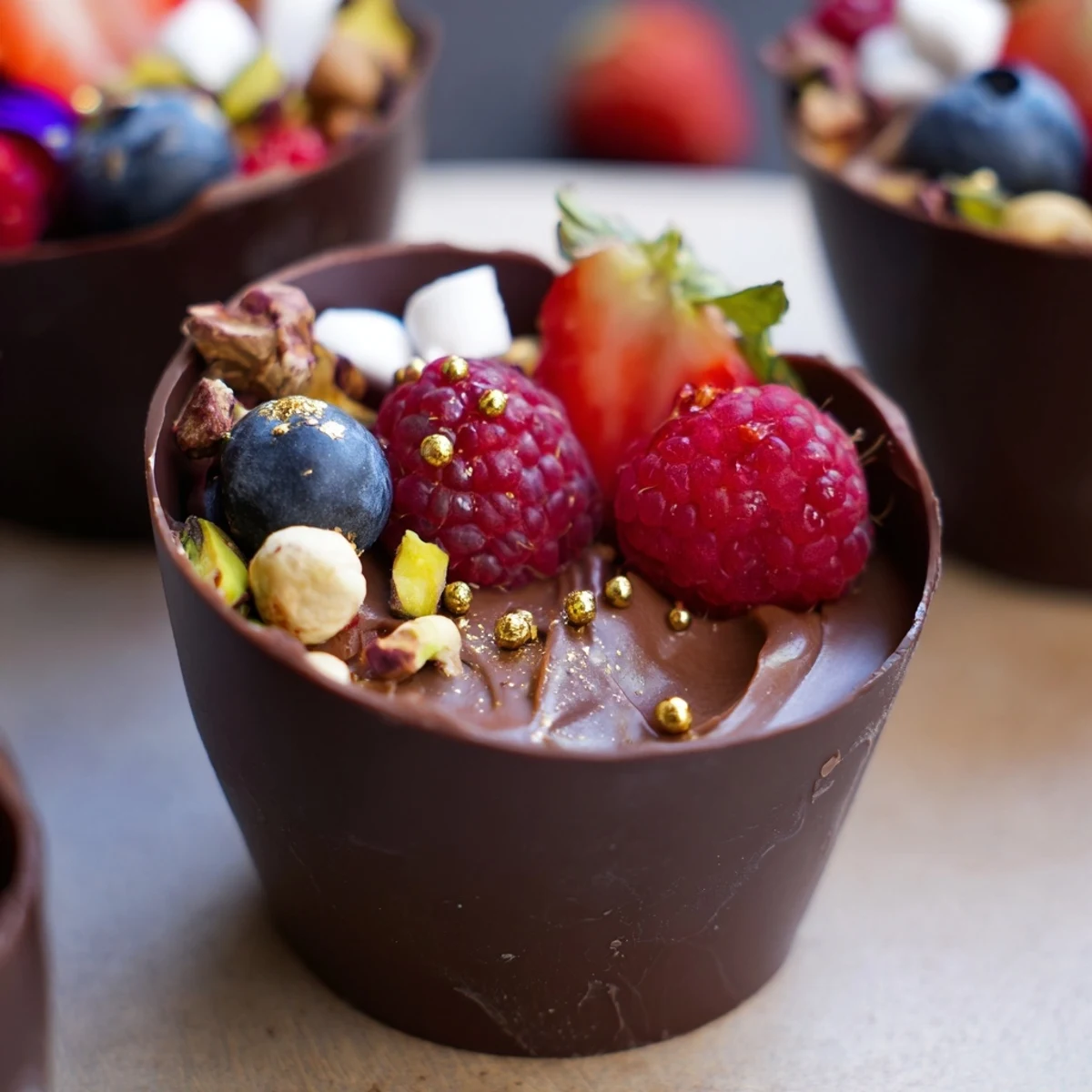The chocolate cups and mousse can be prepared up to 24 hours in advance. Store the unfilled cups in an airtight container at room temperature. Keep the mousse refrigerated separately. Assemble with toppings shortly before serving for optimal texture and presentation.