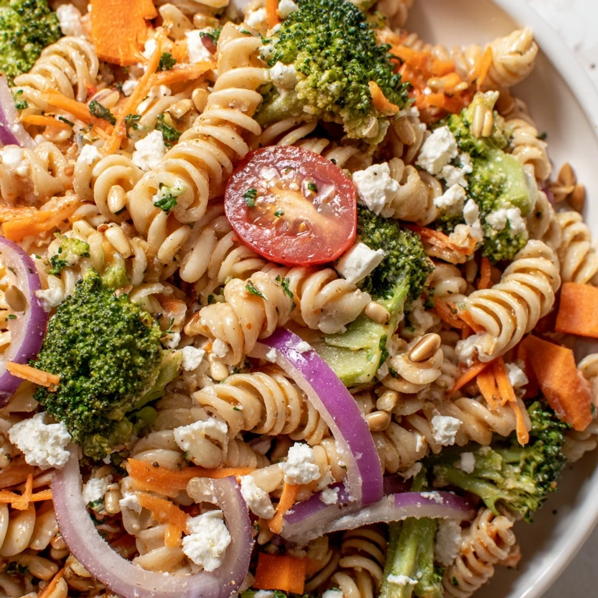 This colorful cold salad combines crisp-tender broccoli florets with perfectly cooked short pasta, all coated in a bright homemade lemon dressing. The fresh vegetables—including cherry tomatoes, red onion, and shredded carrots—add crunch and sweetness, while optional feta cheese brings a creamy, salty finish. Toasted sunflower seeds or almonds provide satisfying nuttiness, and fresh parsley brightens every bite.