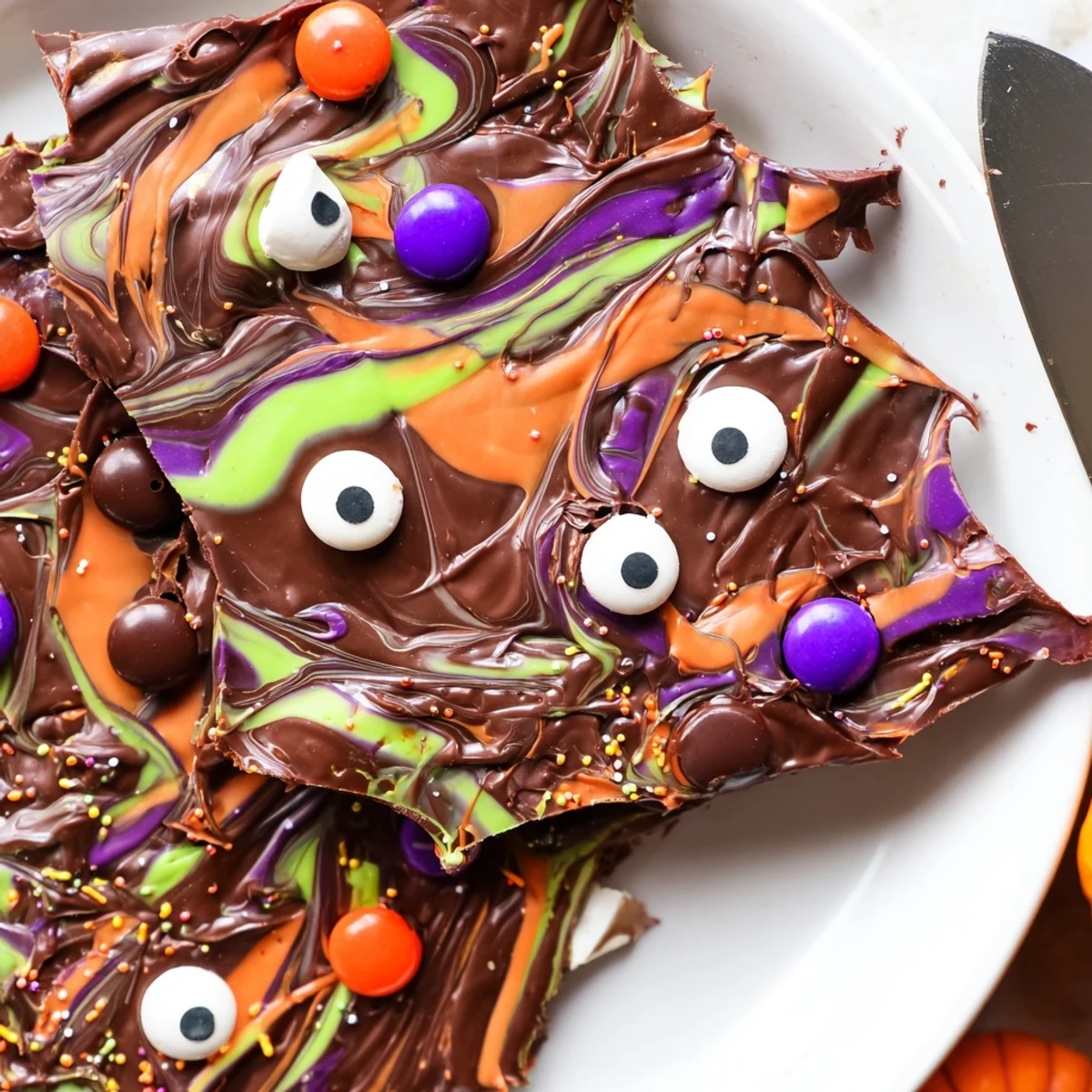 Melting Witches Bark combines semisweet and white chocolate swirled together with colorful candy melts, then topped with candy-coated chocolates and edible eyes. The entire preparation takes just 20 minutes from start to finish, making it an ideal last-minute treat for Halloween gatherings, classroom parties, or spooky movie nights.