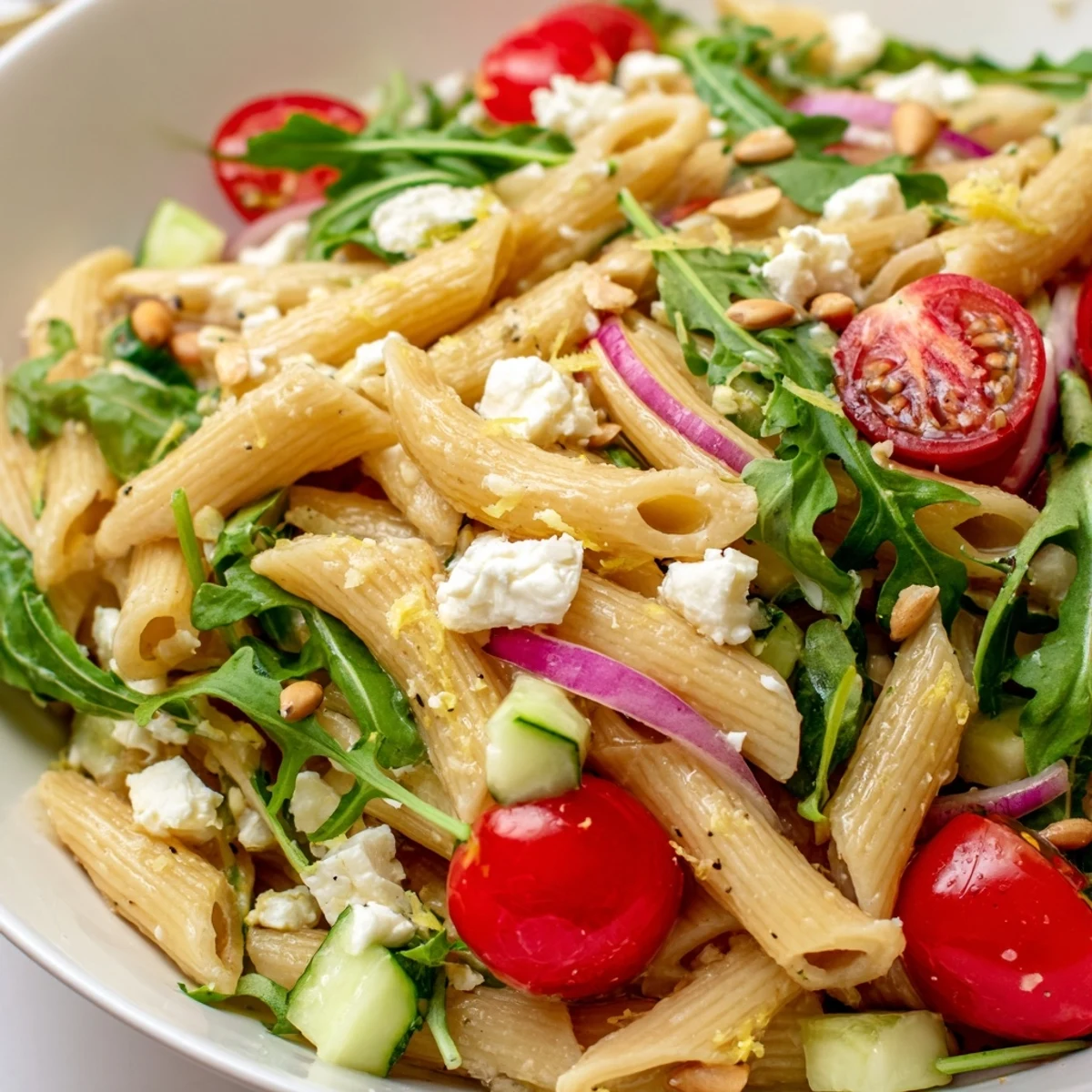 This vibrant pasta salad combines al dente pasta with peppery fresh arugula, sweet cherry tomatoes, crisp cucumber, and thinly sliced red onion. The star of the dish is a bright lemon dressing made with fresh lemon zest and juice, extra virgin olive oil, minced garlic, and a touch of honey for balance.