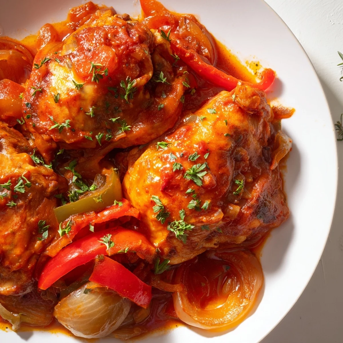 This vibrant Senegalese-style chicken features tender thighs marinated in lemon, garlic, and ginger, then browned and simmered in a rich tomato-based sauce. The dish layers flavors with caramelized onions, bell peppers, and aromatic spices including thyme, paprika, and optional scotch bonnet for warmth.