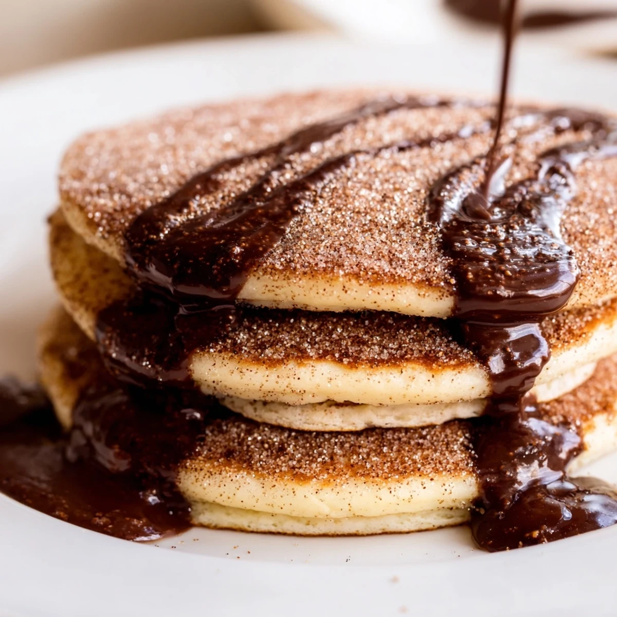These Spanish churro-inspired pancakes combine the best of both worlds—fluffy, golden griddle cakes with the signature cinnamon-sugar coating of traditional churros. Each bite delivers warm, buttery warmth paired with the crunch of spiced sugar, while dark chocolate sauce adds an indulgent finish.