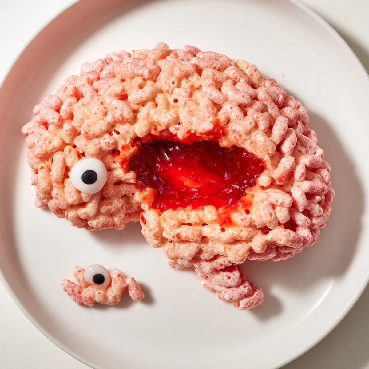The pink or red food coloring gives the crispy rice mixture a brain-like hue, while pressing gentle ridges into the surface with buttered hands creates the characteristic brain texture and appearance.