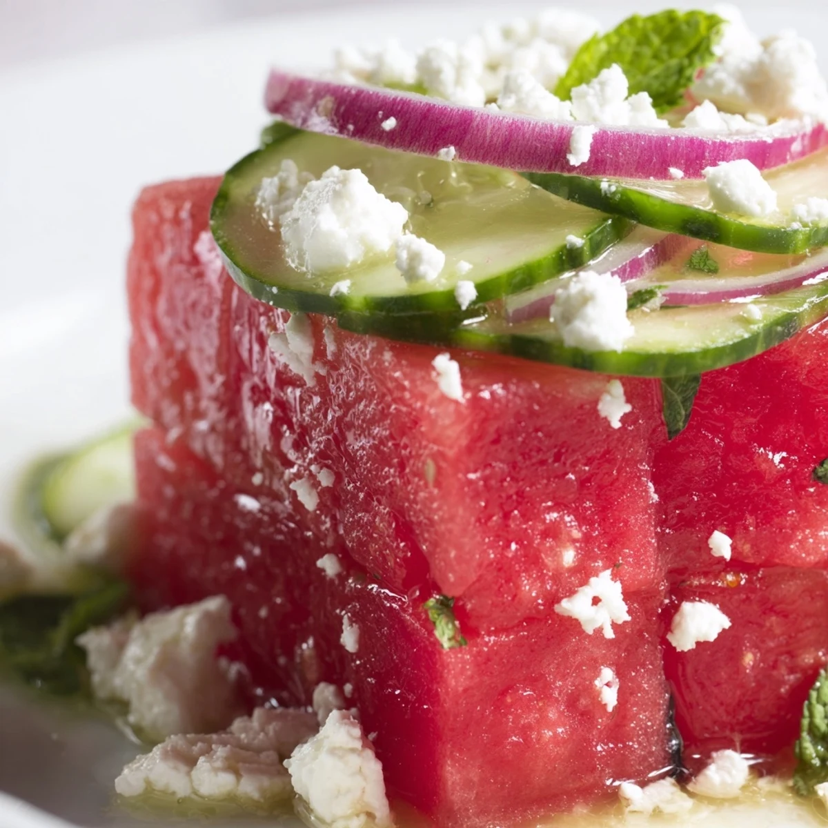 - Gently toss the watermelon, cucumber, and onion with the dressing, using your hands to distribute everything without crushing the delicate fruit